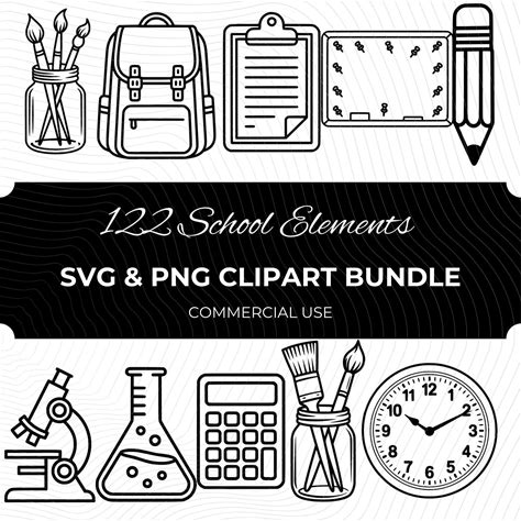 122 School Supplies Clipart, Line Art School Icons, Back To School SVG, Classroom PNG Set, Kids Education Bundle, Teacher Graphics