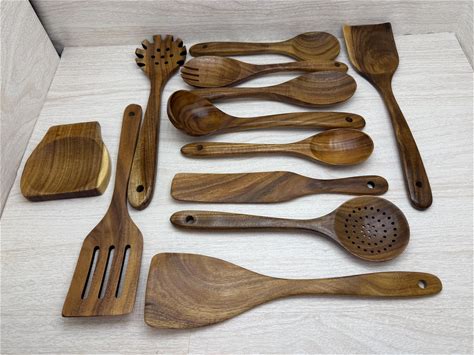 USA Made 12 Piece Set TEAK Wood Handmade Kitchen UTENSILS Set Spatulas Tongs Spoons Cooking Baking Serving Mixing Dixie Cowboy