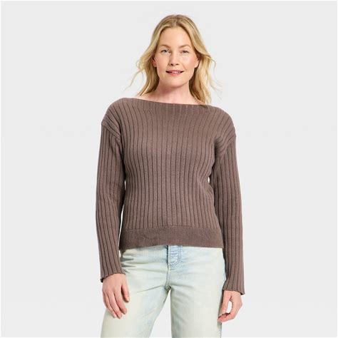 Women's Long Sleeve Ribbed Boat Neck Pullover Sweater - Universal Thread Brown M