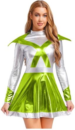 Renvena Womens Alien Astronaut Cosplay Dress Long Sleeve Shiny Metallic Halloween Party Rave Green S