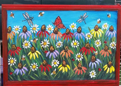 Painted Screen, Painted Window Screen With Bright Flowers, Dragonflies, Butterflies, Bees And Ladybugs